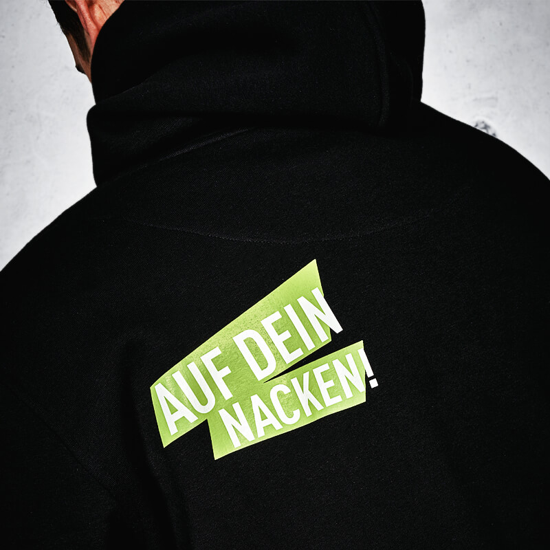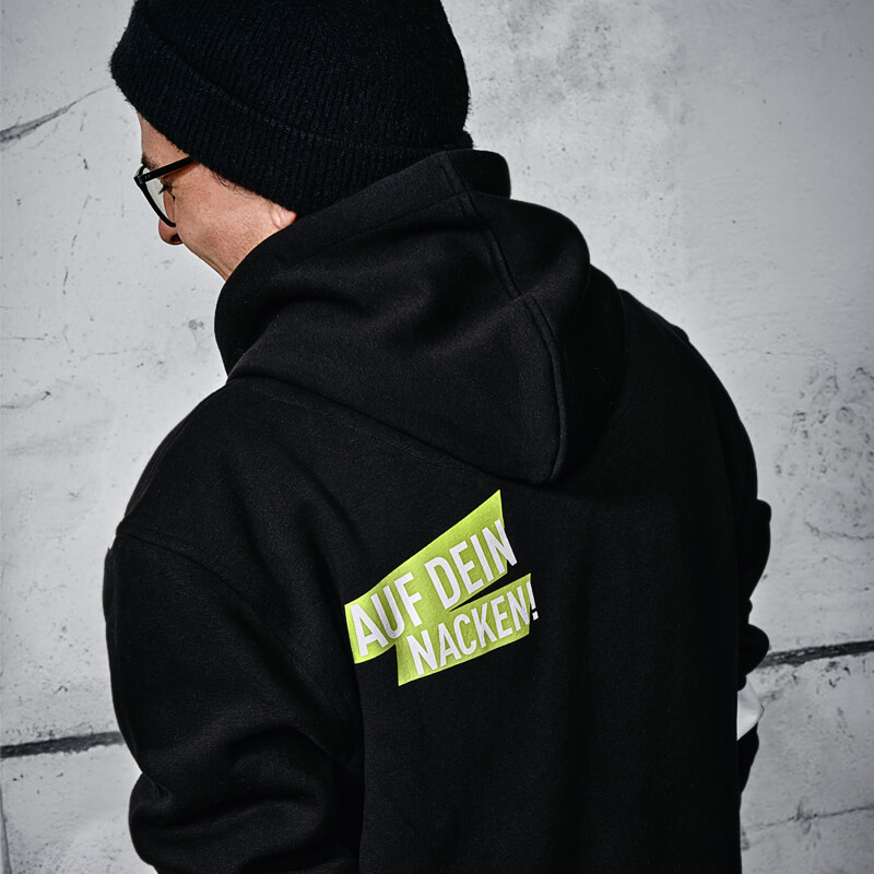 Du hast mal wieder Beef in der Dönerbude? Sucuk, Köfte oder Lahmacun? Kein Ding. Der WTF! SHISHARILLO Hoodie ist fleckenrobust in Schwarz gehalten. Auf der Vorderseite dieser Perle des Merchandise ist ein Print des unverwechselbaren WTF!-Laser-Augen-Piraten-Kopf zu sehen. Das auffällige grüne Innenfutter der Kapuze setzt sich markant vom schwarzen Pulli und dem roten Print ab. Die Kapuze ist zum Schnüren und hält so dem heftigsten Gegenwind stand. Du willst dir nicht auf die Finger gucken lassen. Kein Ding. Die zwei eingelassenen Taschen bieten deinen Händen genügend Schutz. Auf dem Rücken ist ein feines Detail zu finden. Ein Print, der dich an der Bierbude mächtig sparen lässt: Auf dein Nacken! Klein, groß, dick, doof, wir sind auf alles vorbereitet. Dieser stylische WTF! SHISHARILLO Hoodie ist in den Größen S bis XXL erhältlich. Was letzte Preis? 49,95 €. Obwohl das Teil fleckenrobust schwarz ist, kann du deinen Kapuzenpulli bei 40°C auf links waschen. Trockner und Weichspüler sind uncool, es sei denn du liebst es verwaschen oder hauteng und bauchfrei.