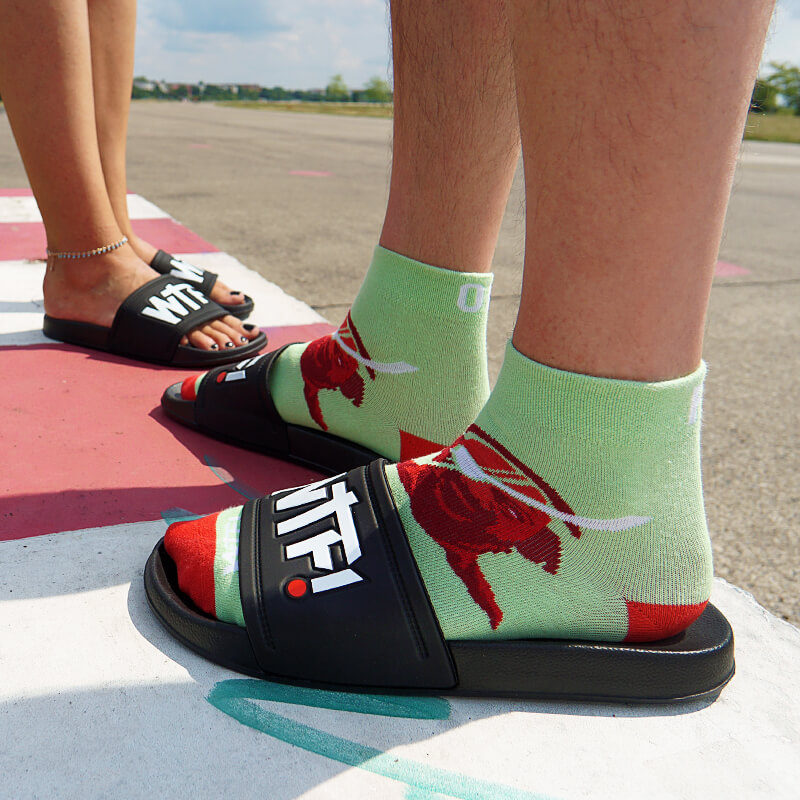 Die WTF! Kultschlappe ist mehr als nur eine gewöhnliche Badeschlappe. Dieses Kunststoffgeschoss macht dich metrosexueller als Justin Bieber. Wallah, Fußmodels bekommen Schweißfüße wenn sie nur an dieses zeitlose It-Piece denken und bei Bodenfrost einfach schnell mit „FCK OFF“ Socken in die Latschen slippen, dann is nich so kalt.
